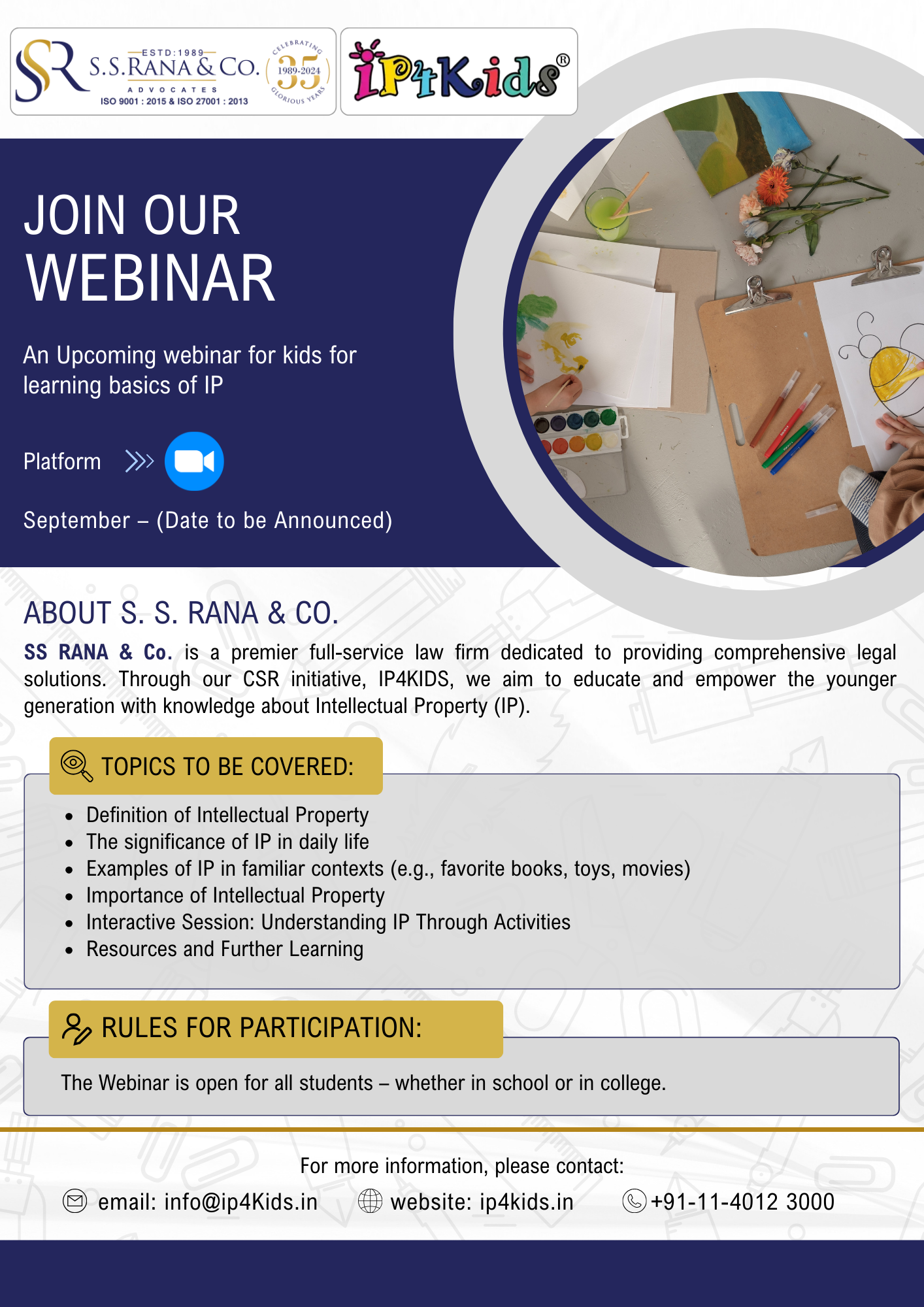 SS RANA & Co. is a premier full-service law firm dedicated to providing comprehensive legal solutions. Through our CSR initiative, IP4KIDS, we aim to educate and empower the younger generation with knowledge about Intellectual Property (IP).